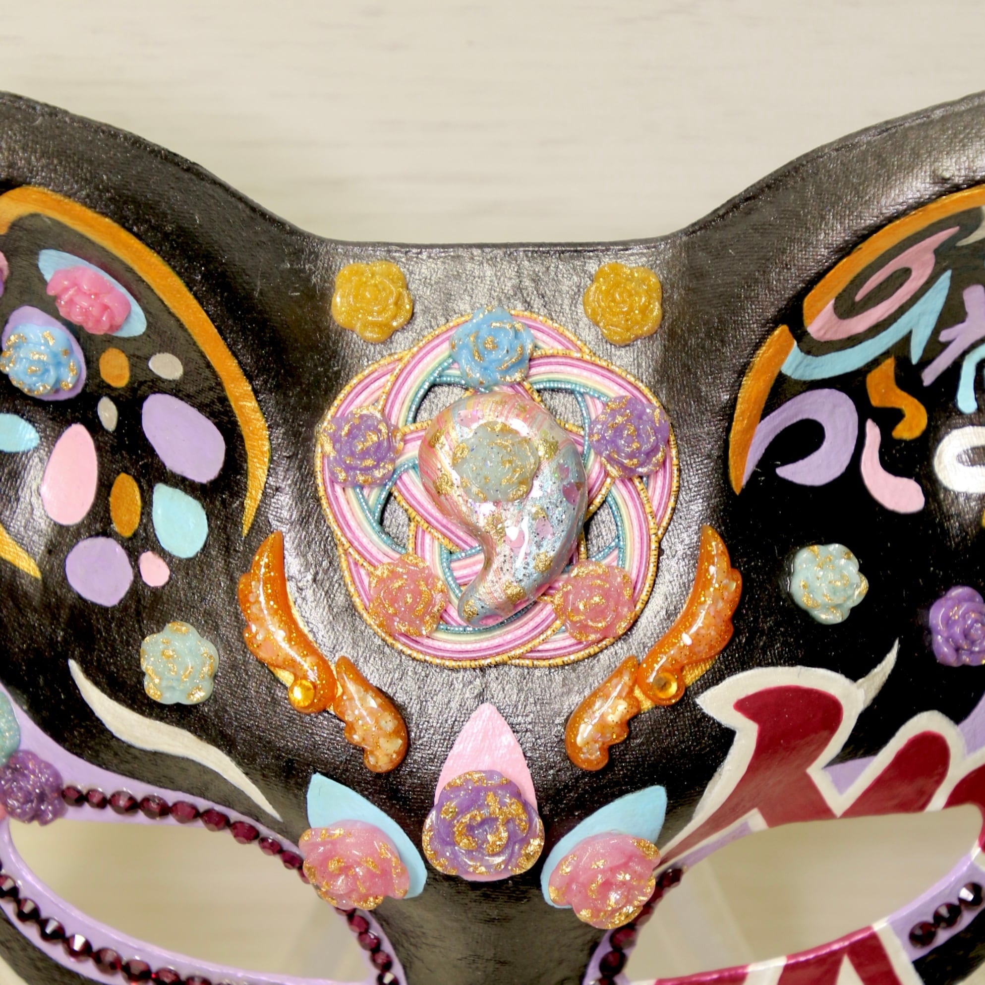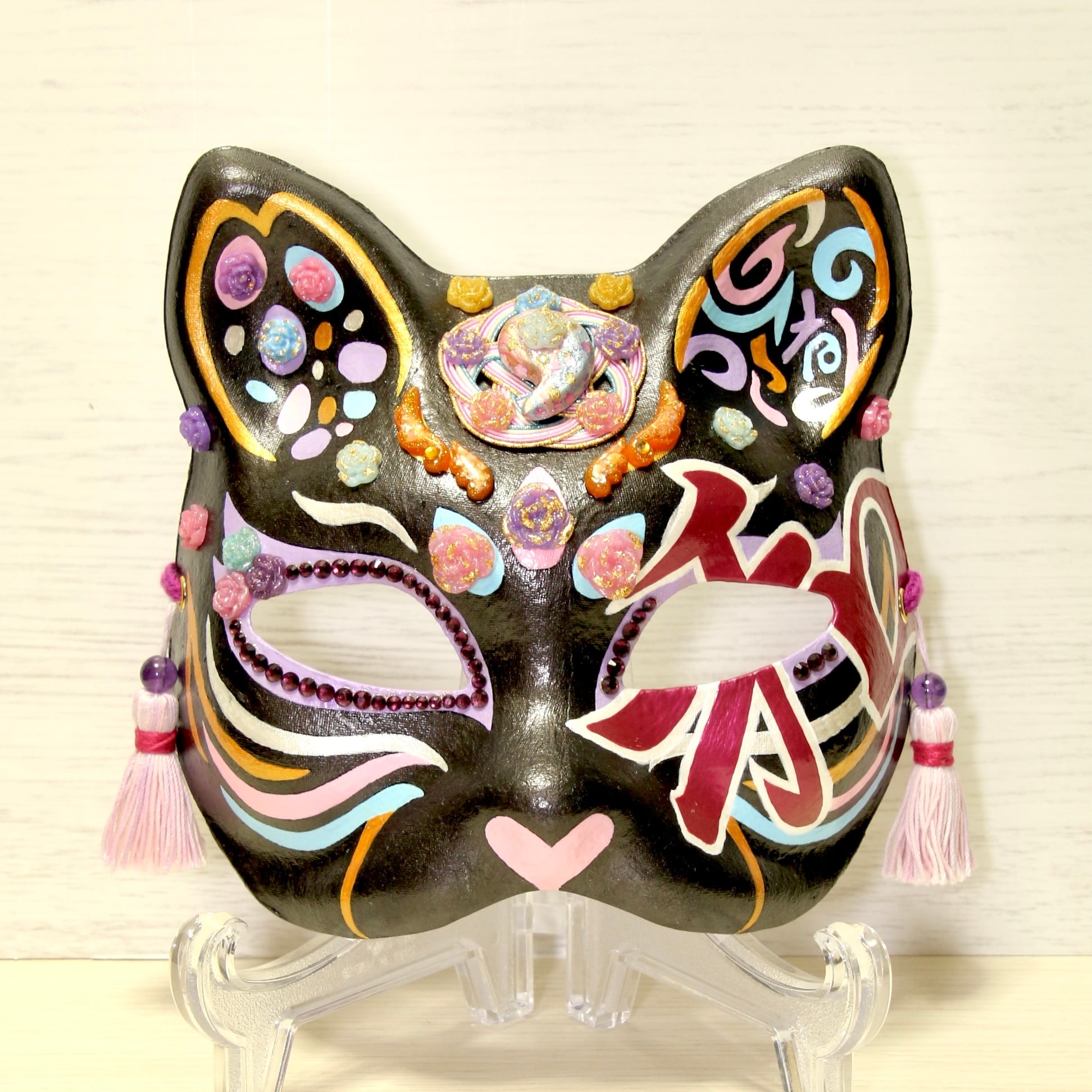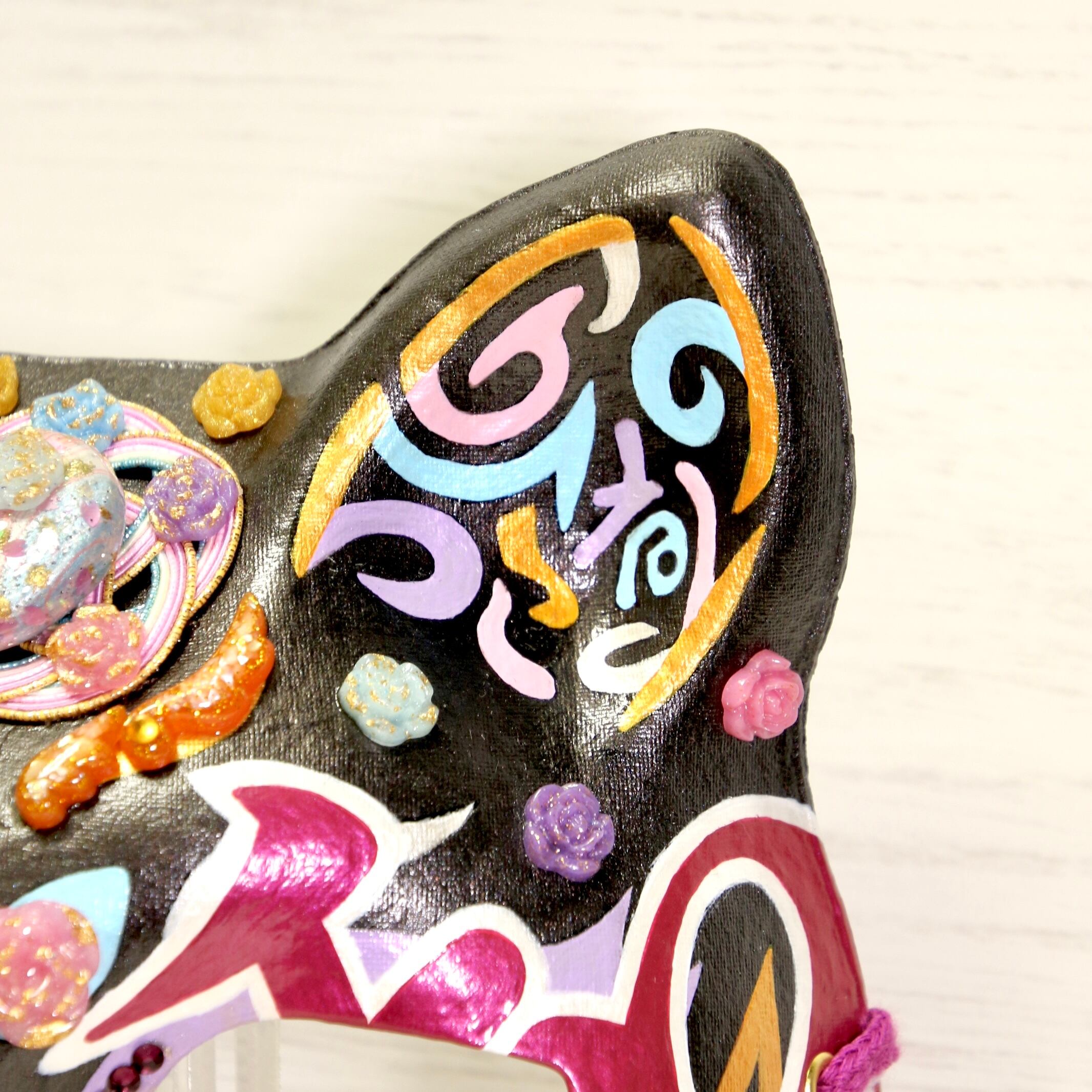 この猫面は、黒地に描かれた紫・ピンク・水色・ゴールド・シルバーの美しい模様が印象的で、独自の存在感を放っています。
