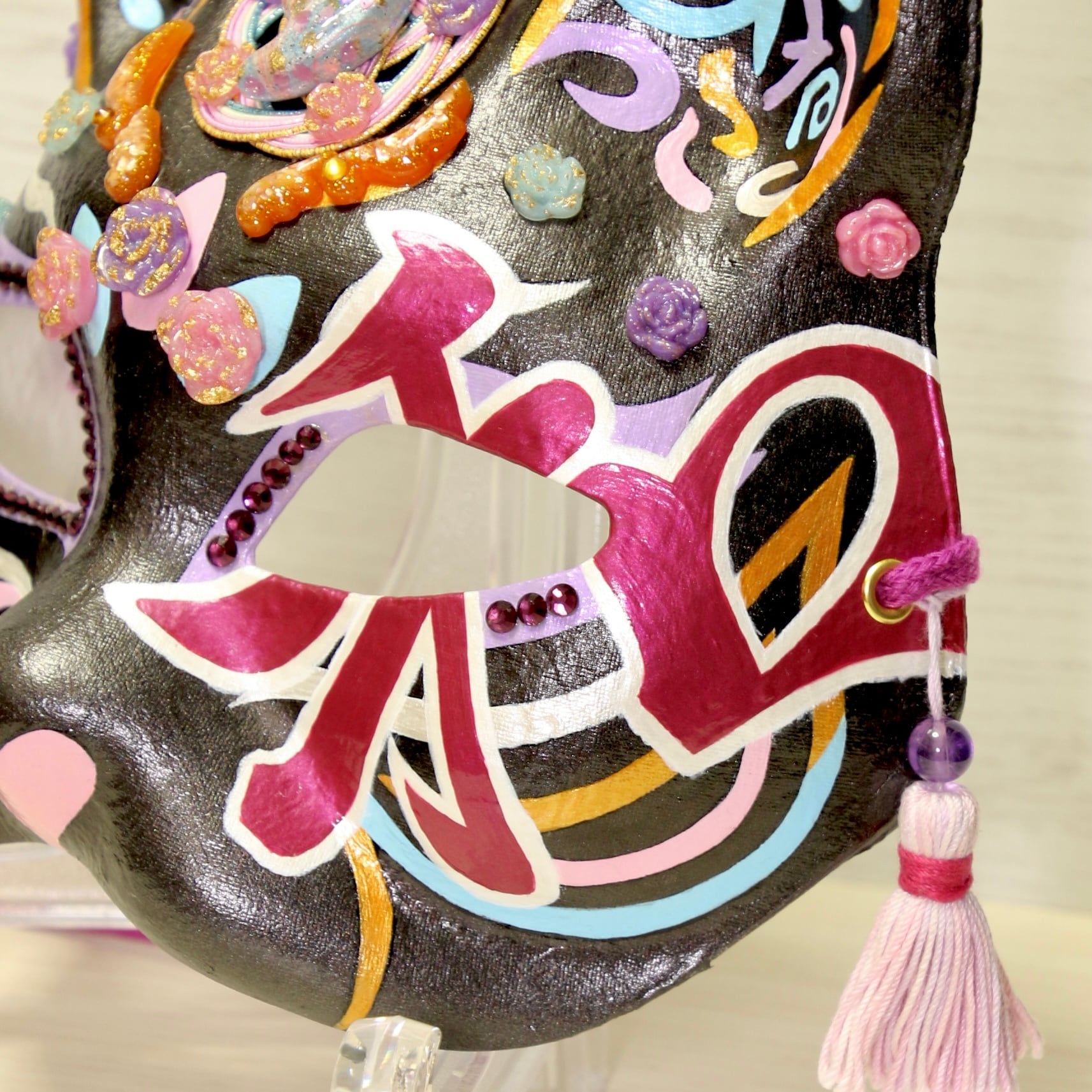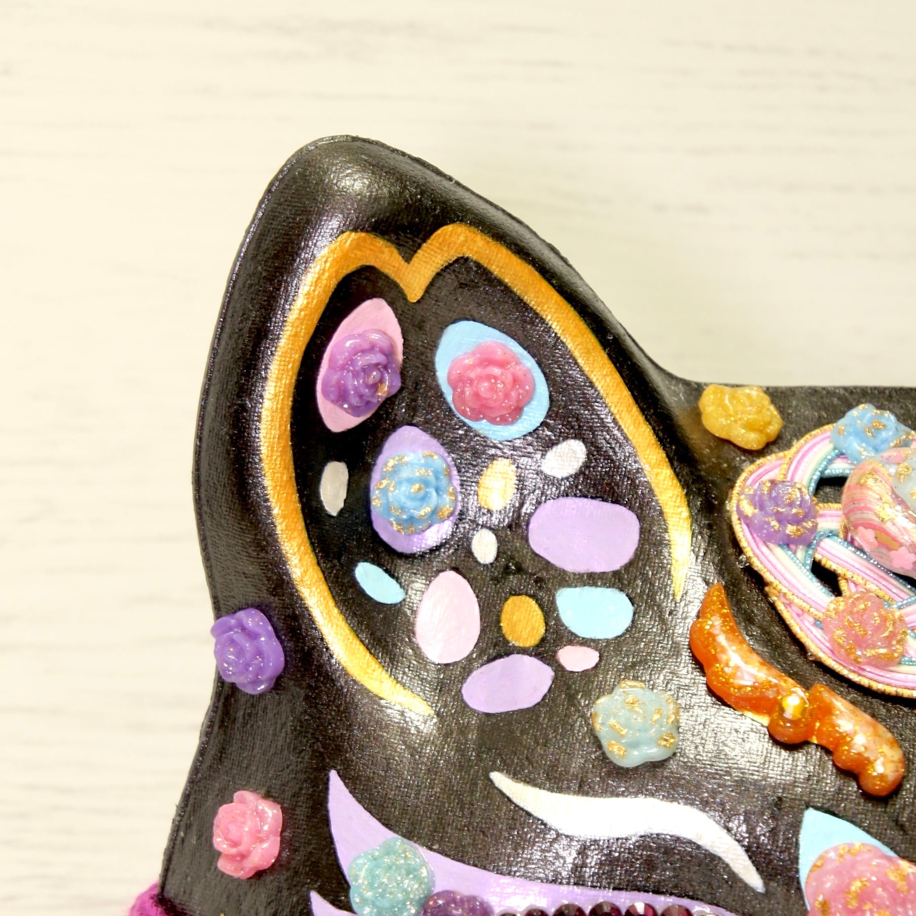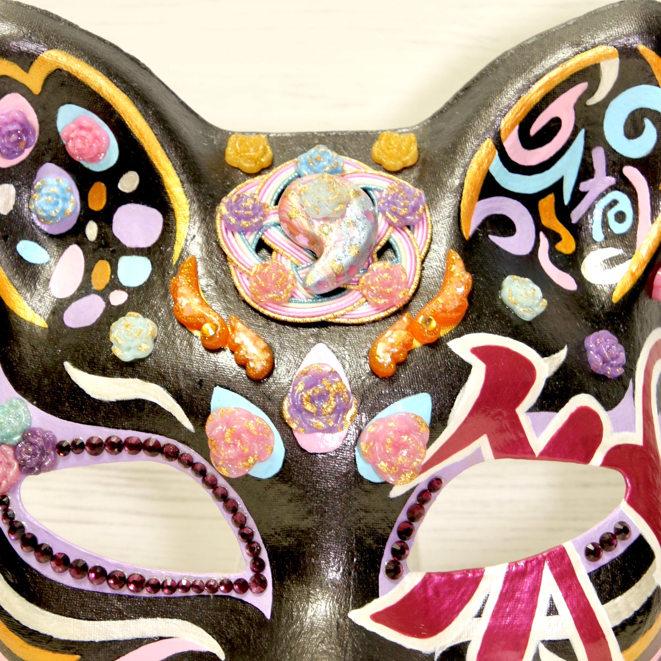 この猫面は、黒地に描かれた紫・ピンク・水色・ゴールド・シルバーの美しい模様が印象的で、独自の存在感を放っています。