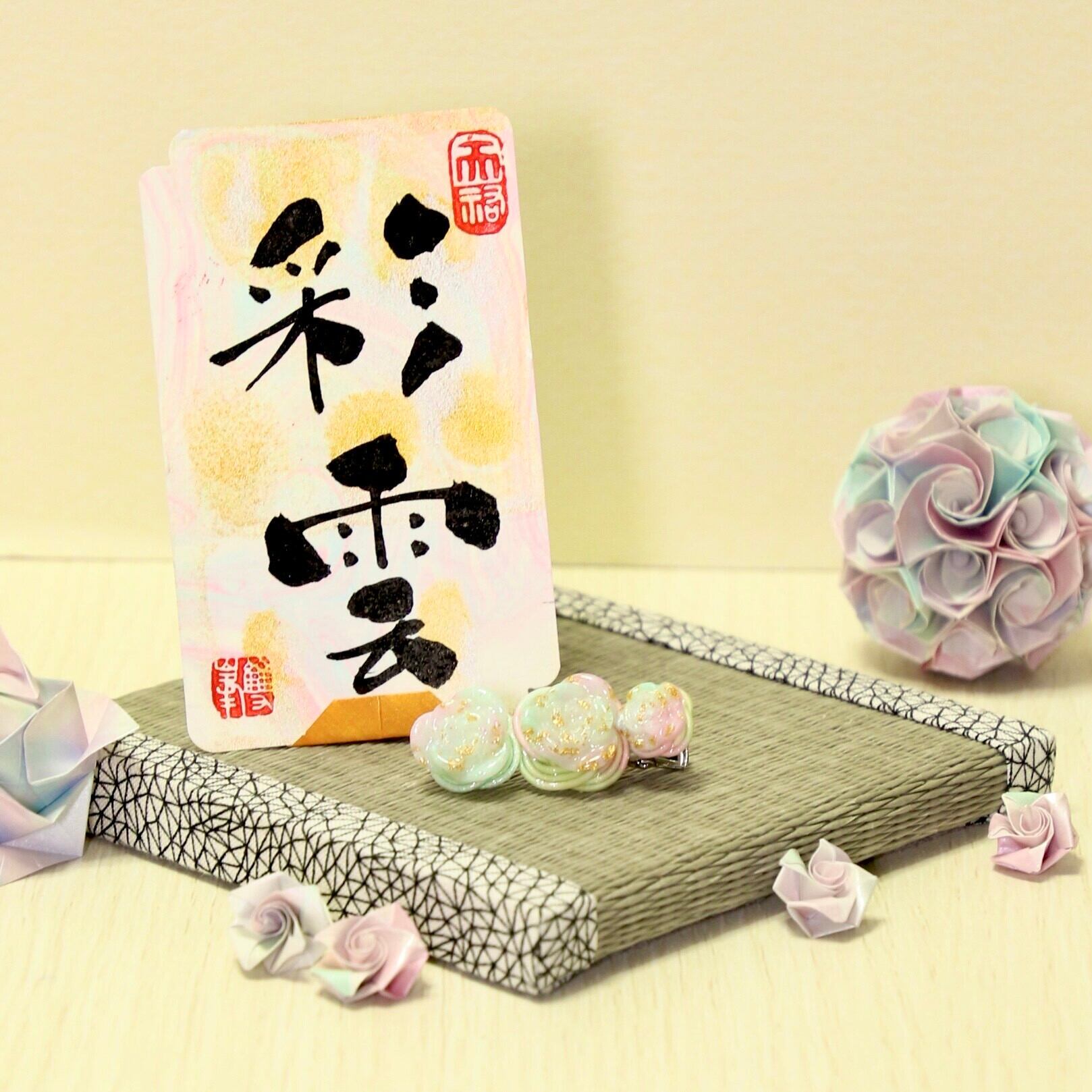 このヘアクリップは、色鮮やしいレインボー水引と、優しいパステルカラーのレジンで作られたバラを巧みに組み合わせており、太陽の光を浴びることで一層輝きを増します。