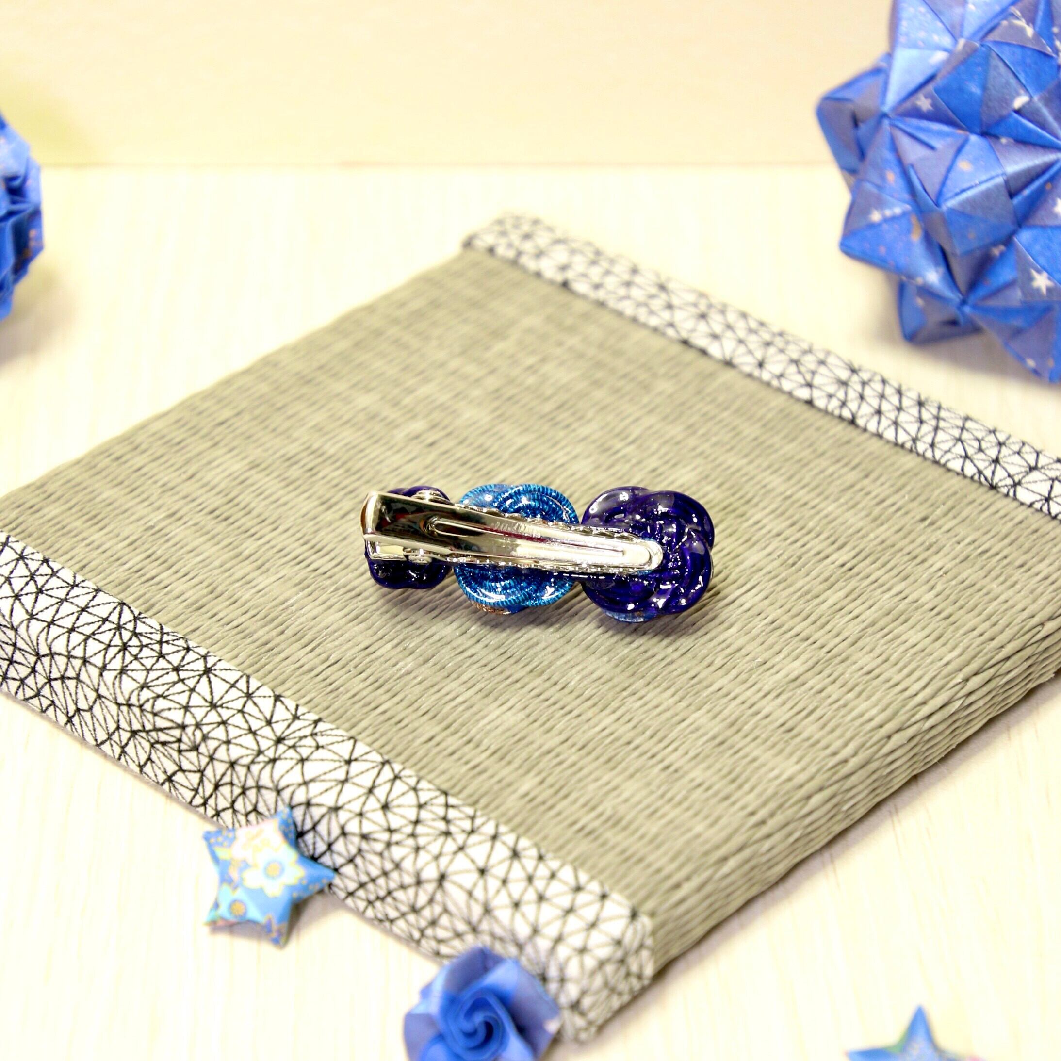 このヘアクリップは、深い藍色や鮮やかな青色の水引と、美しい青いレジンで作られたバラを巧みに組み合わせており、ラピスラズリをイメージした色合いが魅力を引き立てます。