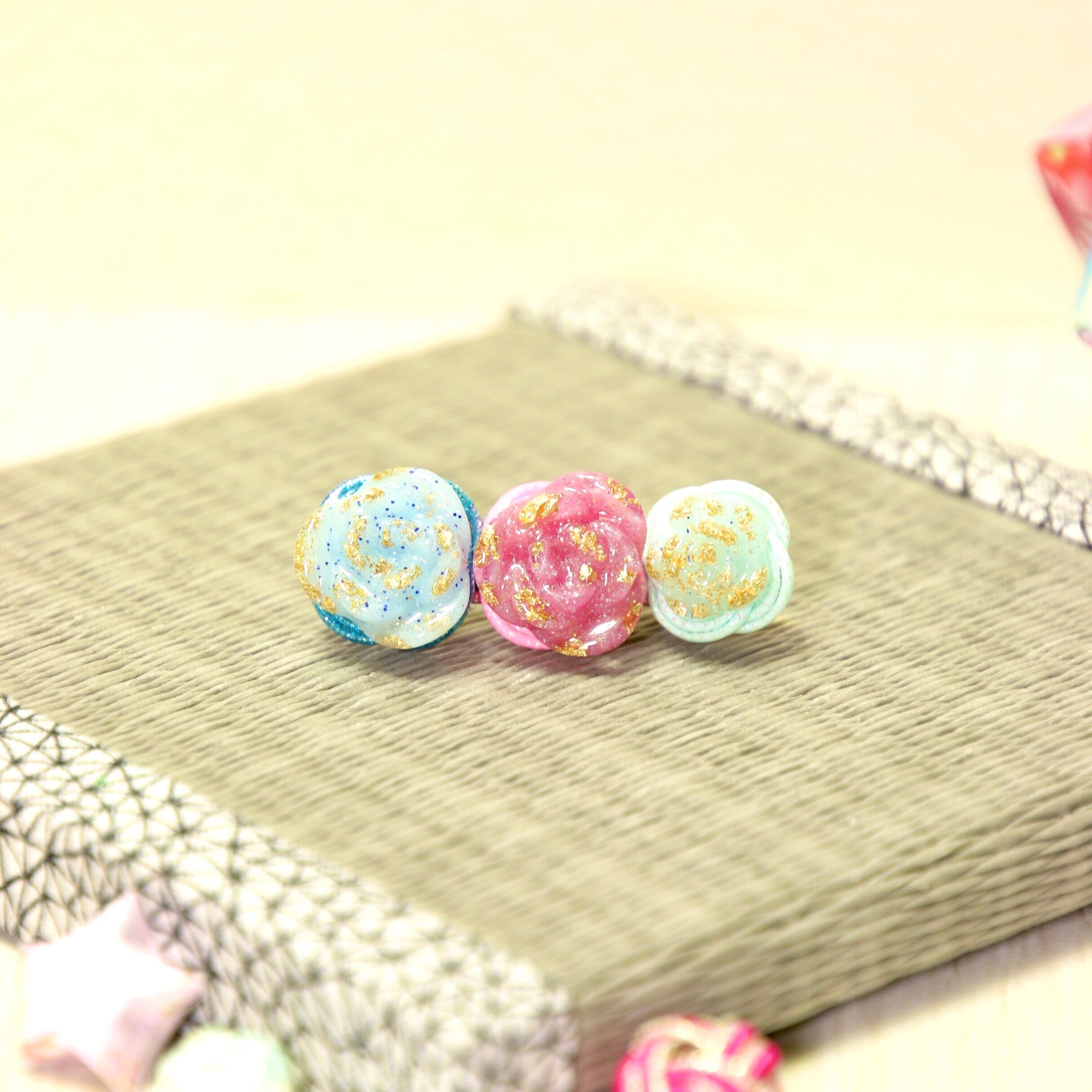 このヘアクリップは、ピンクと水色のレジンで作られたバラと、同じ色合いの水引を巧みに組み合わせており、色合いの美しさが際立っています。