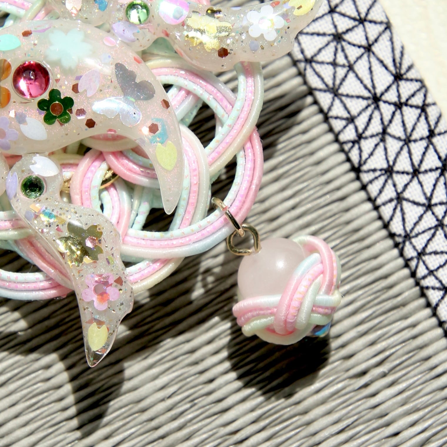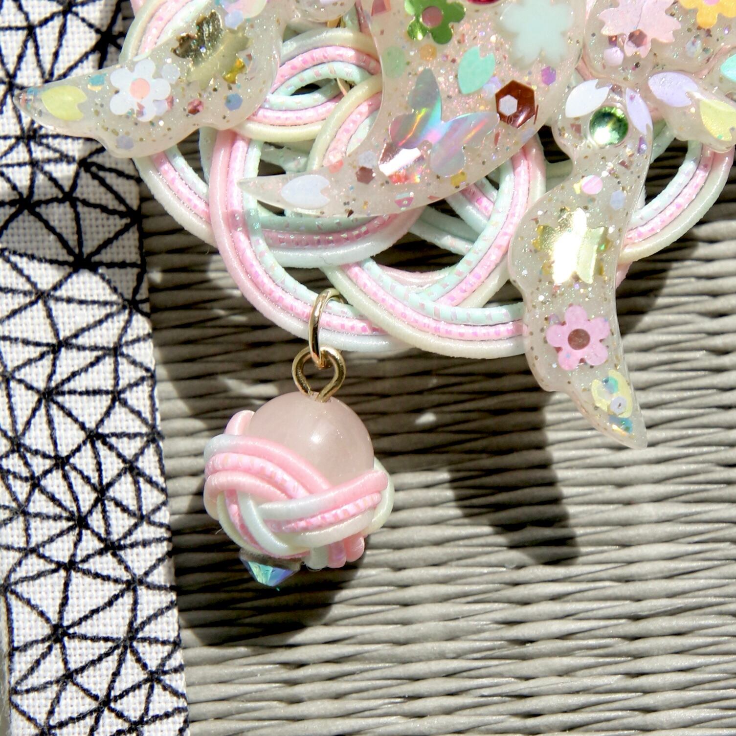 このピアスは、レインボー水引をベースにした色鮮やかなデザインが目を引き、レジンで作られた勾玉と翼のチャームを見事に組み合わせています。