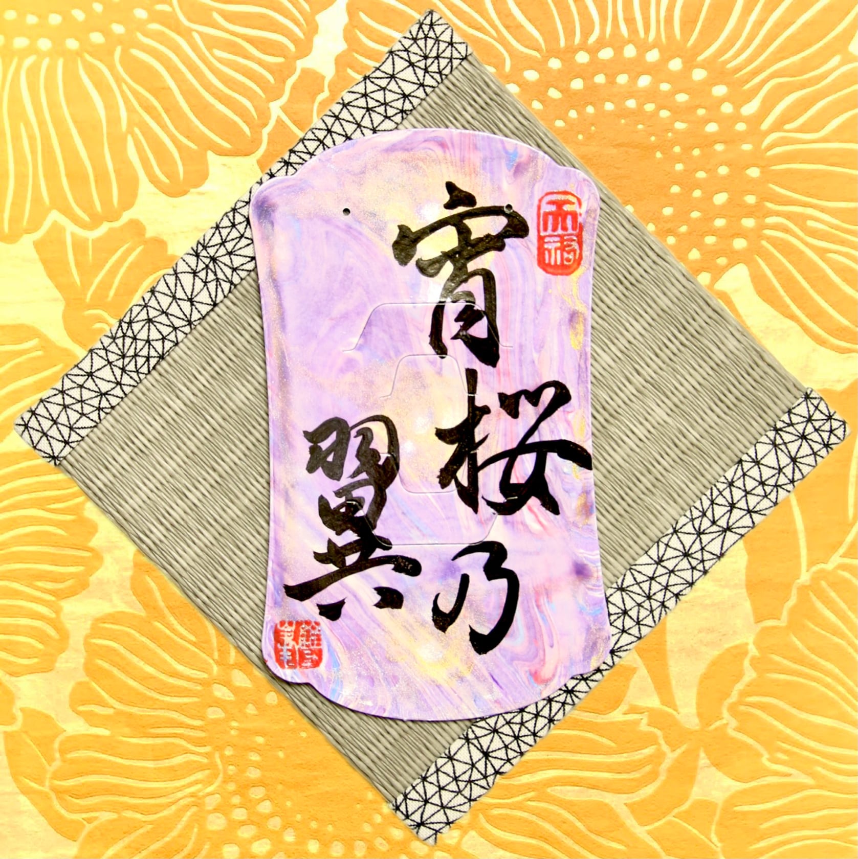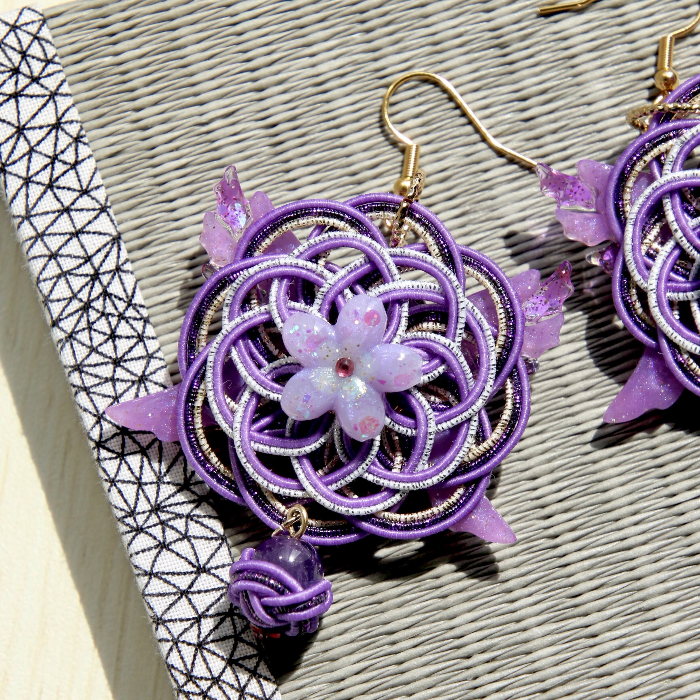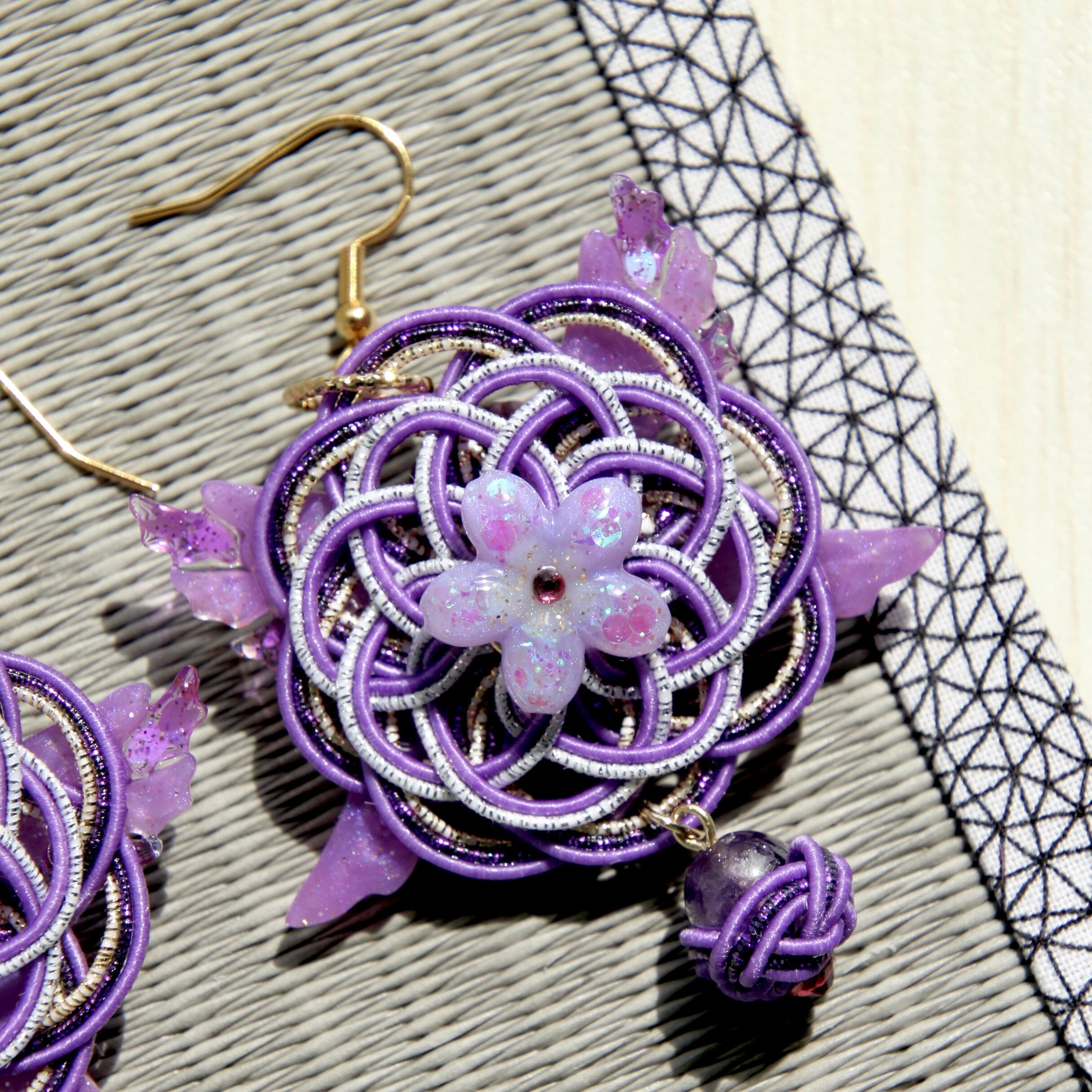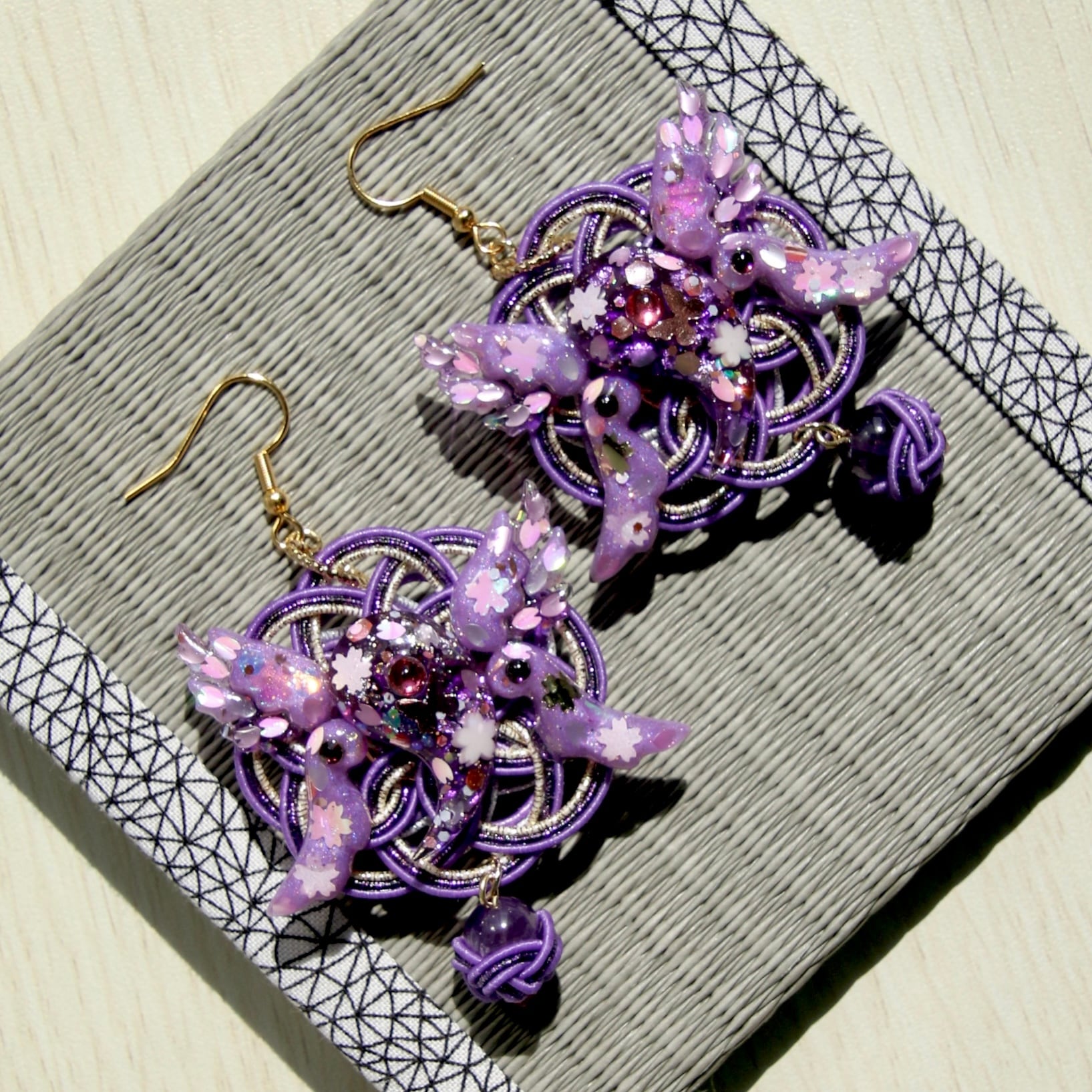 このピアスは、紫色の水引を基調に、夜桜をイメージして作られた、美しいレジンの勾玉と翼を見事に組み合わせています。