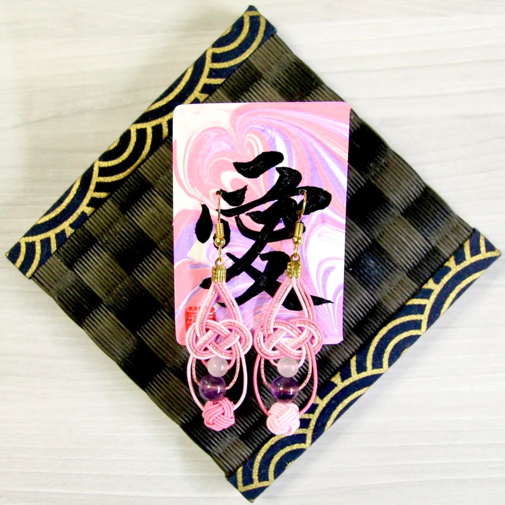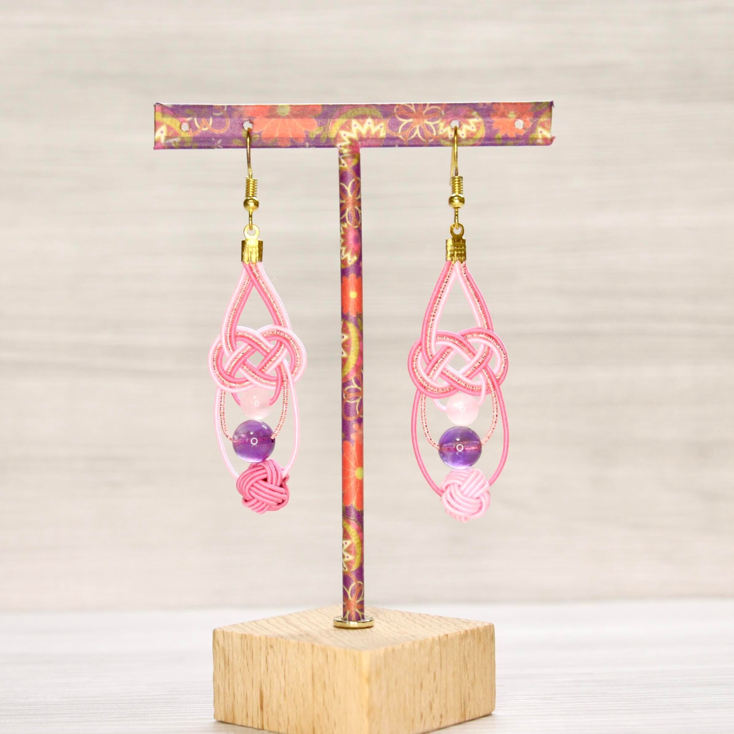 ピンク色の水引で作った雫型のピアス【愛の雫】。