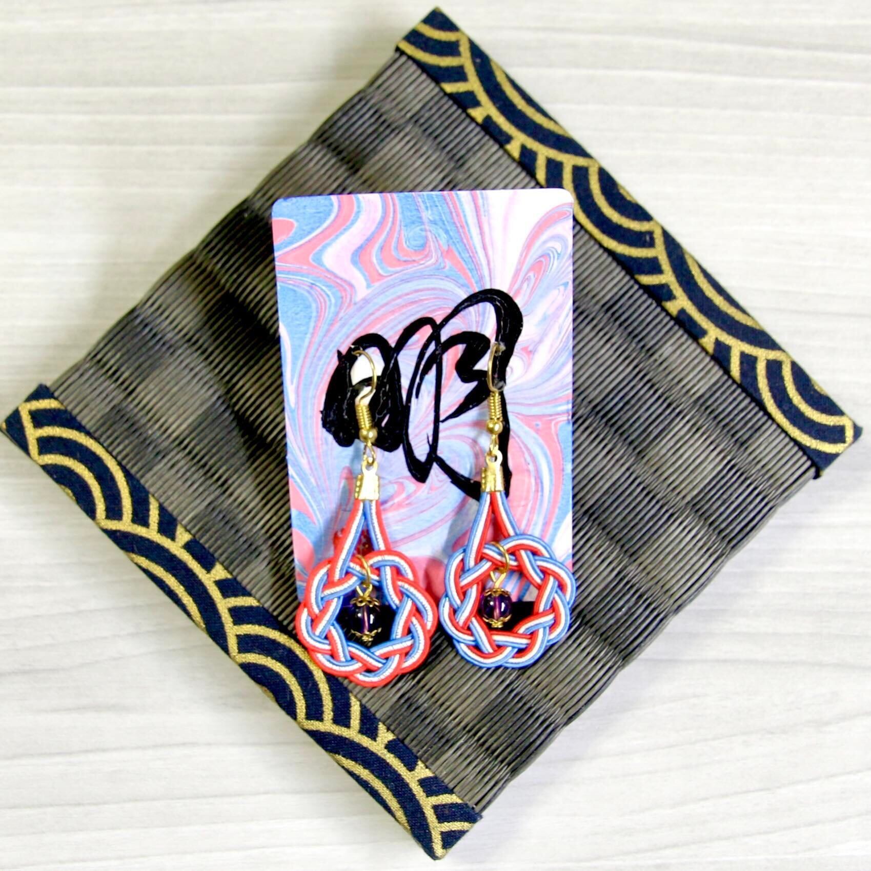 太陽を象徴し、活発なイメージの赤と、月を象徴し、冷静なイメージの青の水引が編み込まれた、きらめく円形ピアス。