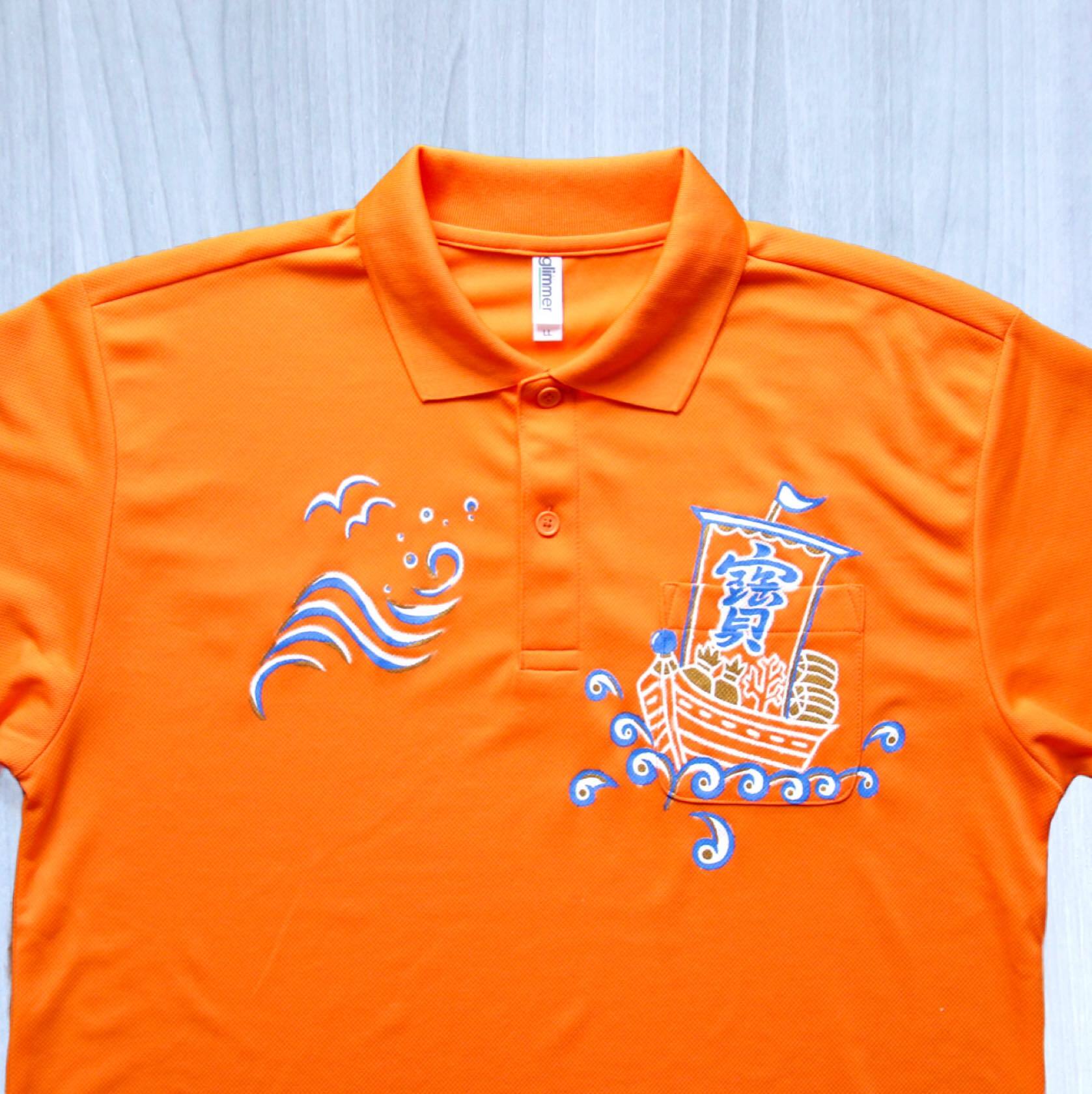 寶船と波の美しい模様を描いた、鮮やかなオレンジ色のポロシャツです。