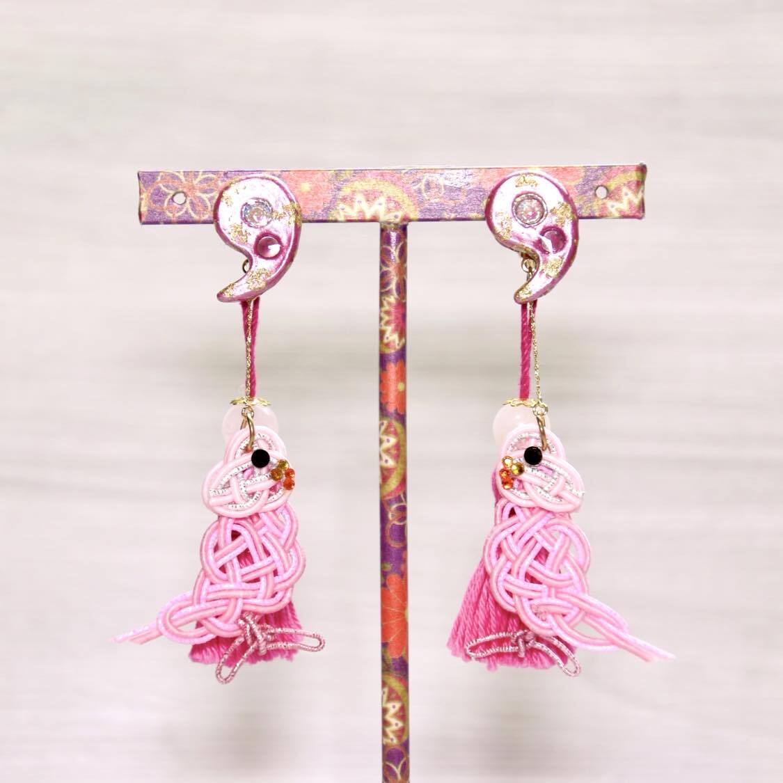 陶土で作られた勾玉、水引で結んだインコ、ローズクォーツを付けたタッセルが特徴的なデザインです。