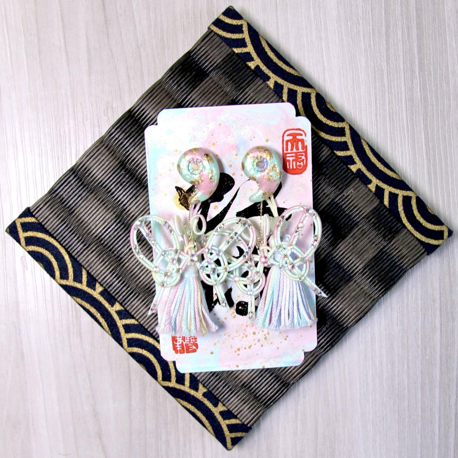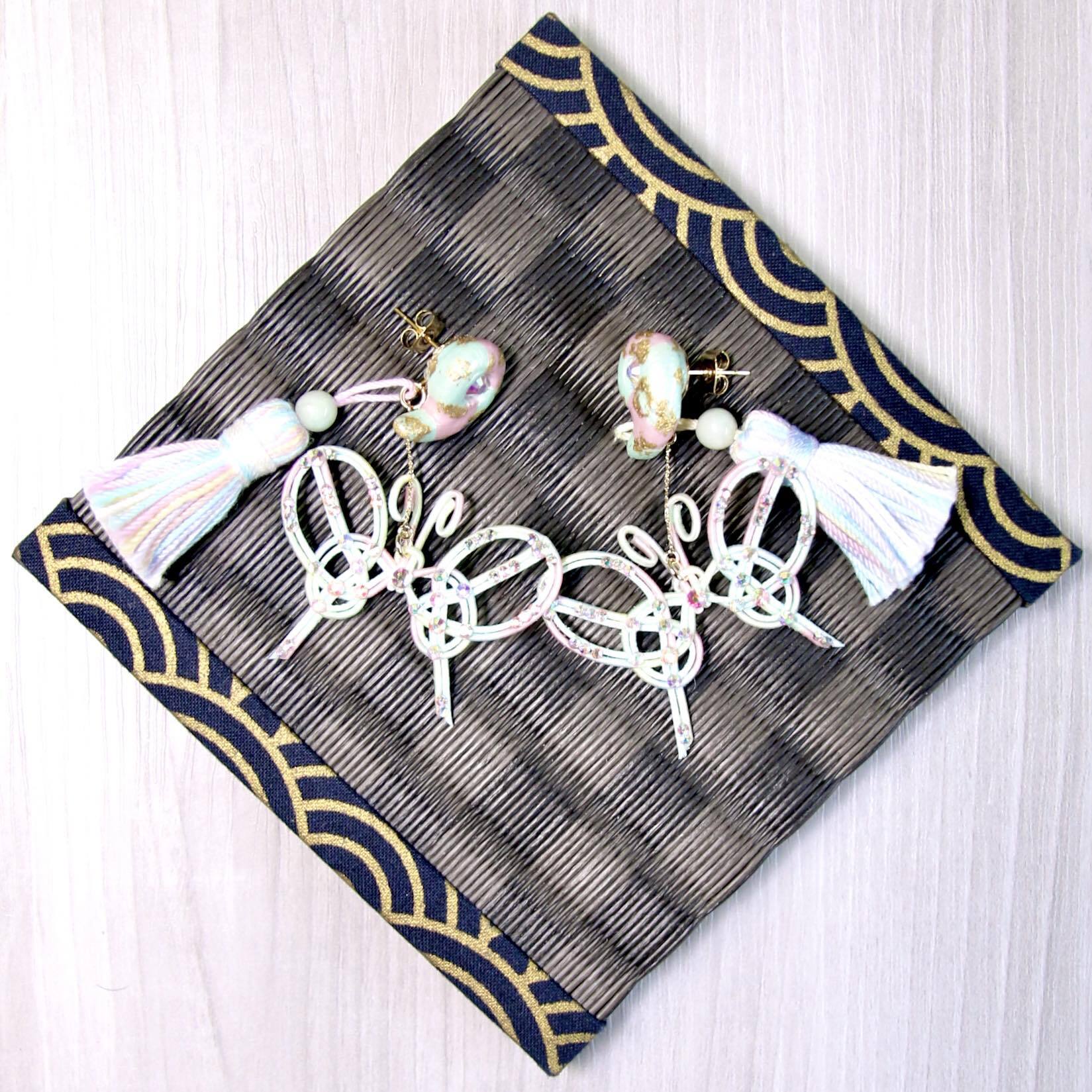 レインボー色の水引が美しいちょうちょと、勾玉・タッセルが組み合わさったデザインは、まるで魔法のような輝きを放ちます。